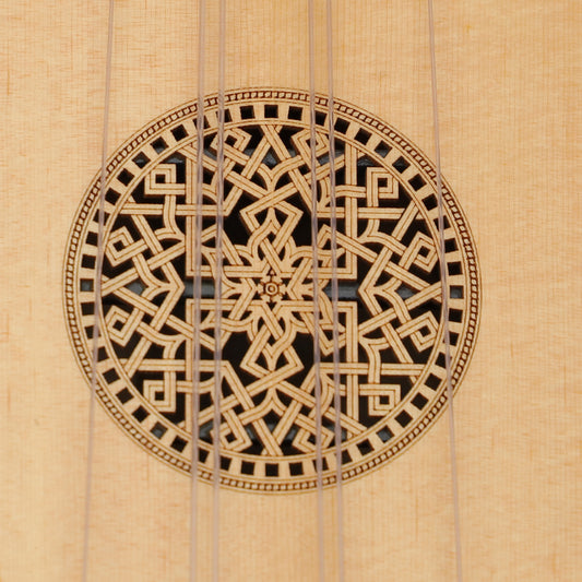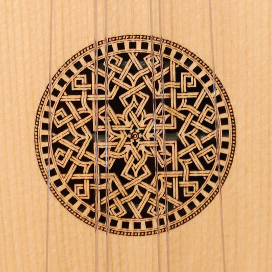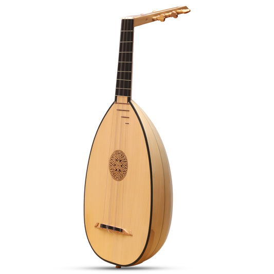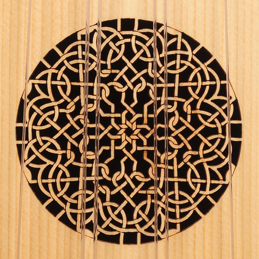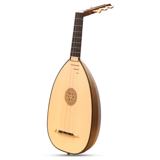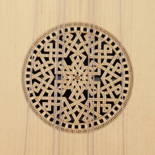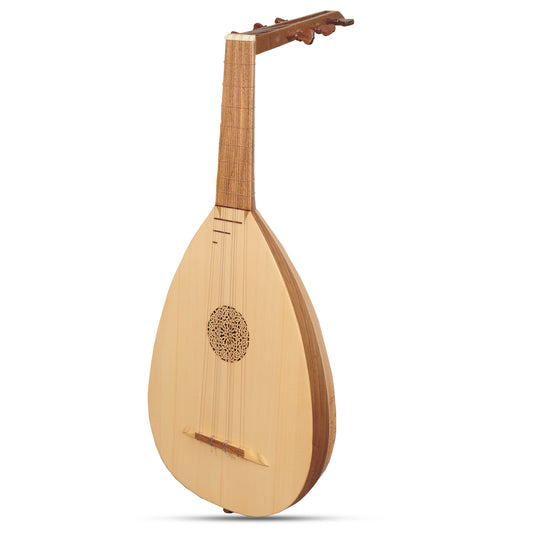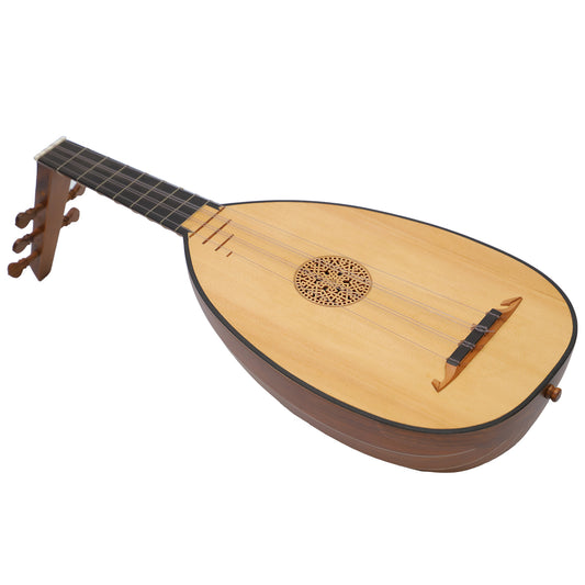 The Muzikkon Lute Ukulele or Lute has 6 strings and creates a sweet and bright tone. The Renaissance Lute ukulele is ideally suited for classical and finger style music. This Tenor-sized instrument is based upon a 430mm (17 inches) scale. The second (E) and third (C) strings are doubled providing a rich, full and balanced sound. It is played like any normal 4-string ukulele. It consists of a European spruce soundboard with the famous Leonardo Knot rosette, commonly used by many Renaissance lute makers. The back is made in the traditional manner with alternating staves of walnut and lace wood. The neck and pegbox are solid walnut and feature a cattle-bone nut with a width of 37mm (1 1/2 inch). An endpin strap button is standard to allow for a strap. Muzikkon have a range of Lute Ukuleles including left-handed Lute ukulele models. Suggested tuning from high to low: A4, E4, E4, C4, C4, G4 (can vary depending on player preference). Each ukulele comes with padded Case and Extra String set.