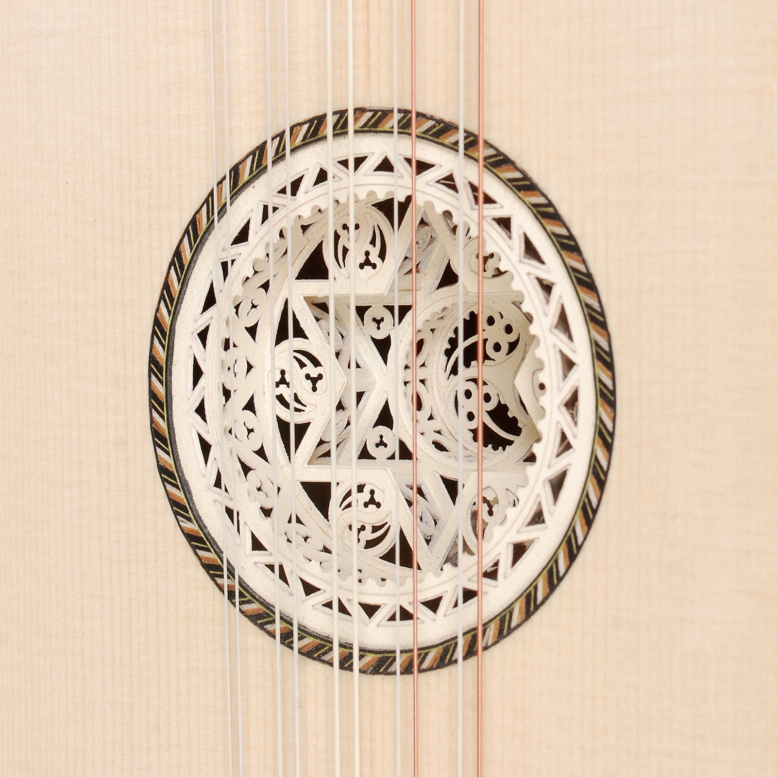 • Solid Sitka Spruce soundboard with 4 layers deep, parchment style rosette