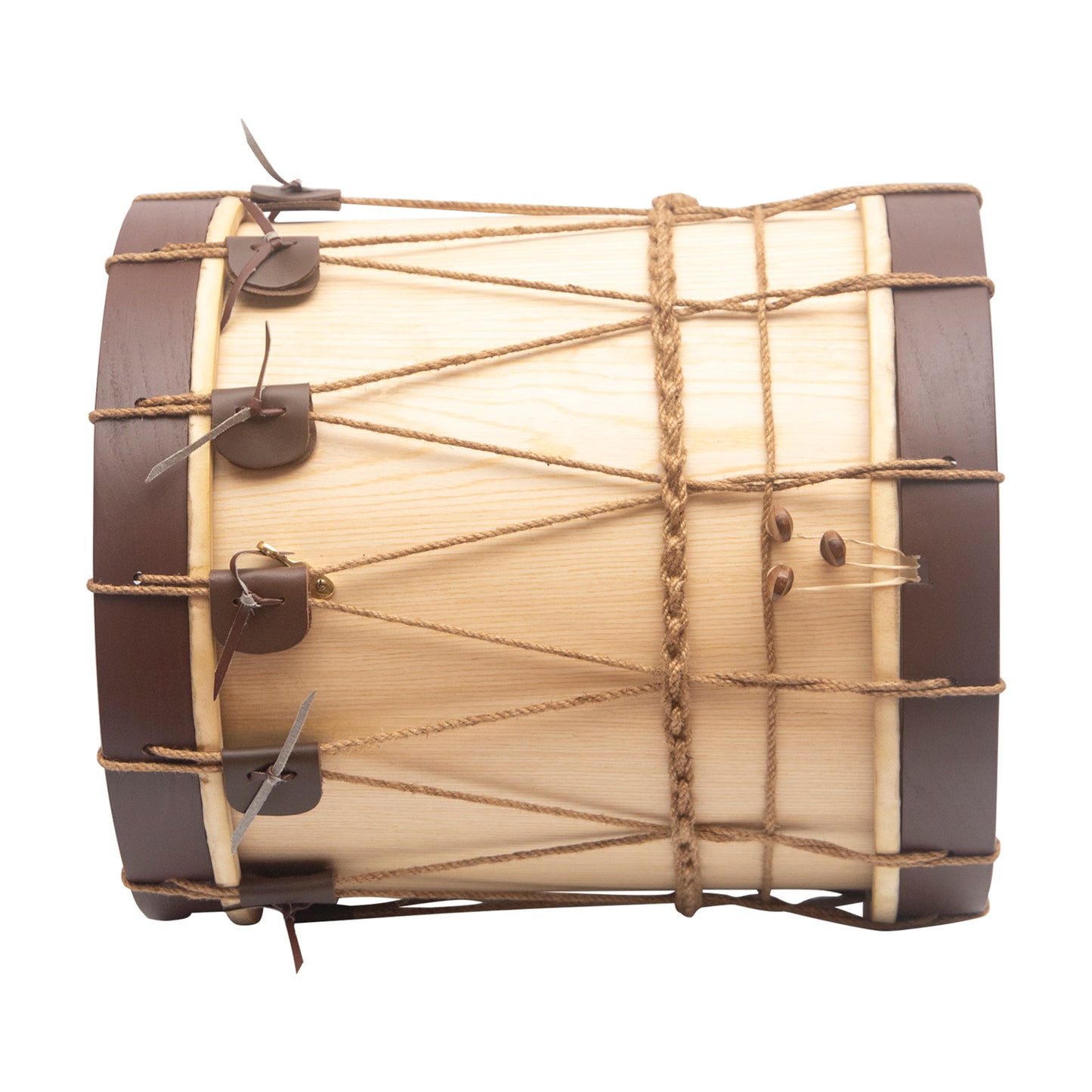 These Renaissance Drums are made with two rope tuned high quality goat skin heads that are rolled and stitched with the snare on the top head.