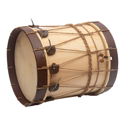 This cylindrical drum has two heads, one with a snare. When the drum head is struck with the drum sticks, the snare adds vibration, or rattle, to the drum's din.