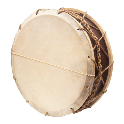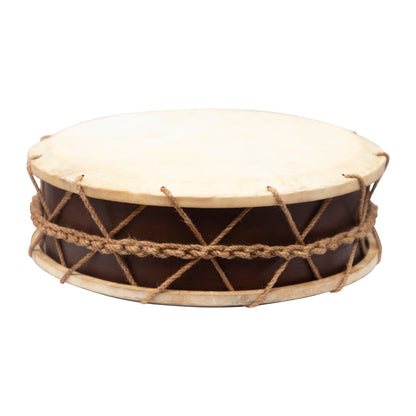 An authentic medieval tabor with a single snare, using only best quality goat skin heads. The two goat skin heads are tied to a wooden frame with hemp rope.