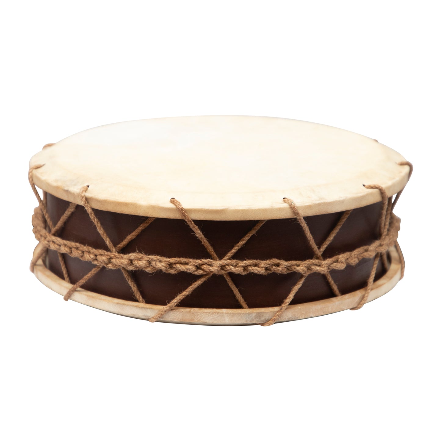The shell is traditionally tin so the light weight instrument could be carried, and played, for long periods of time. The heads are usually rope tuned with a snare on one side.