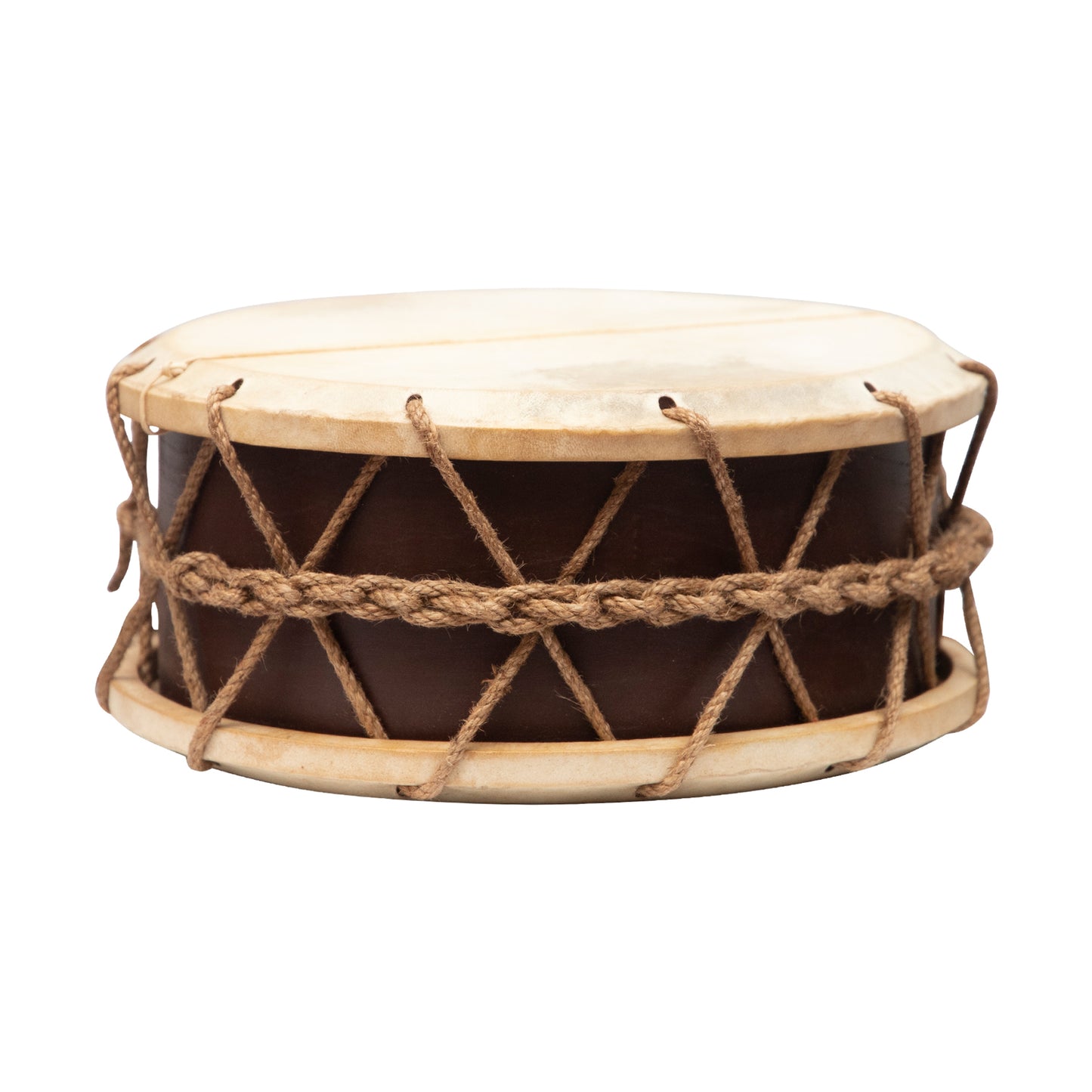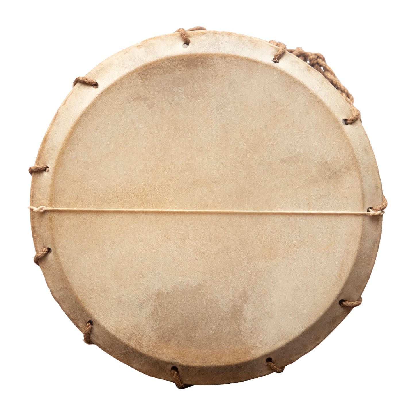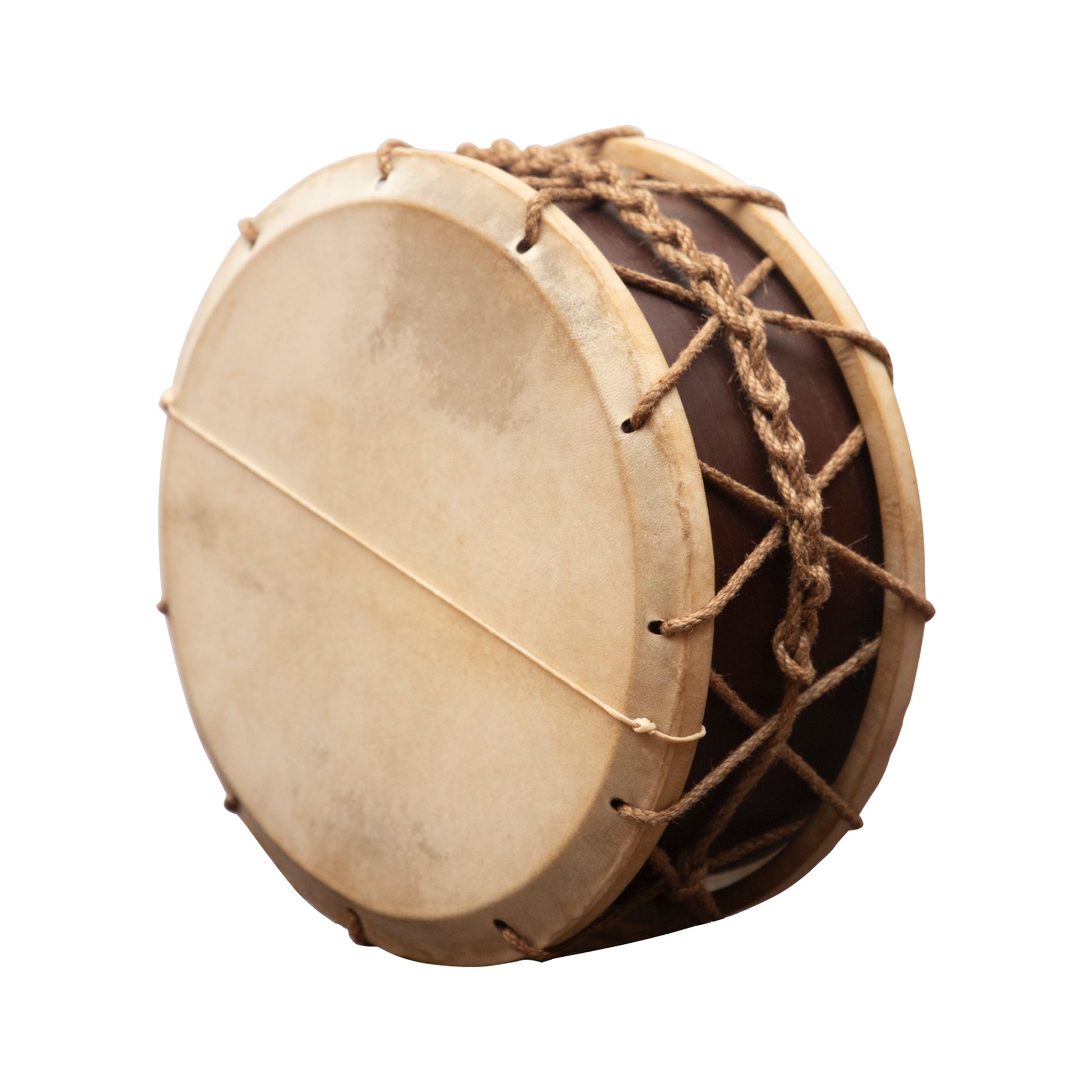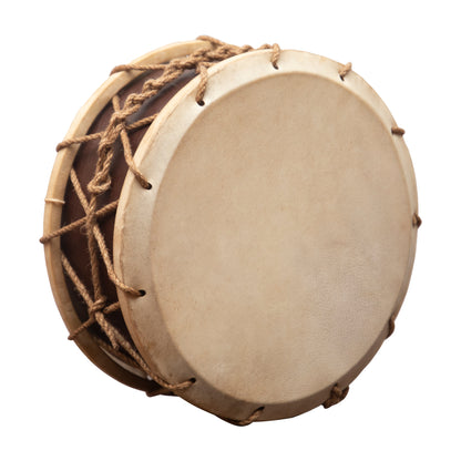 An authentic medieval tabor with a single snare, using only best quality goat skin heads. The two goat skin heads are tied to a wooden frame with hemp rope.