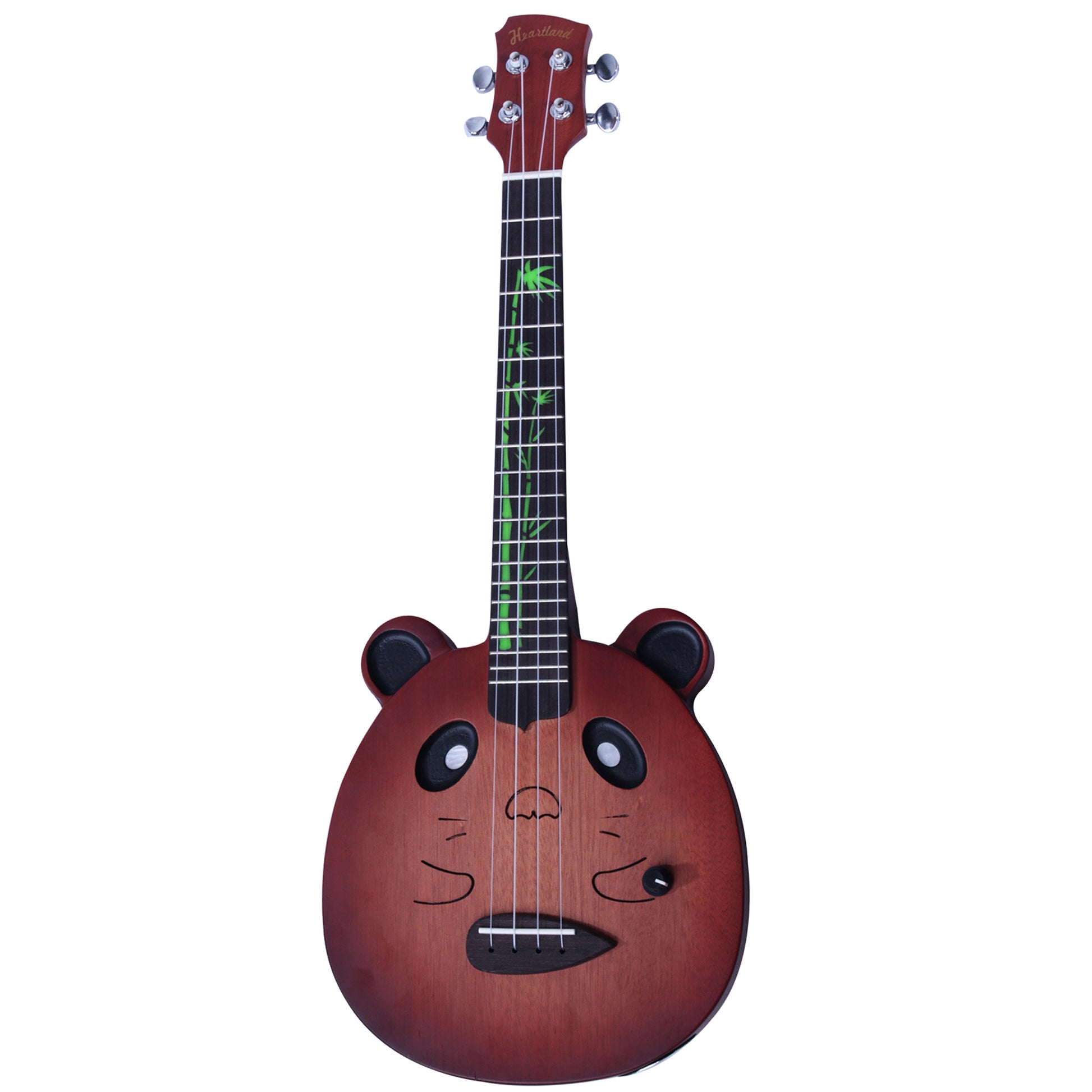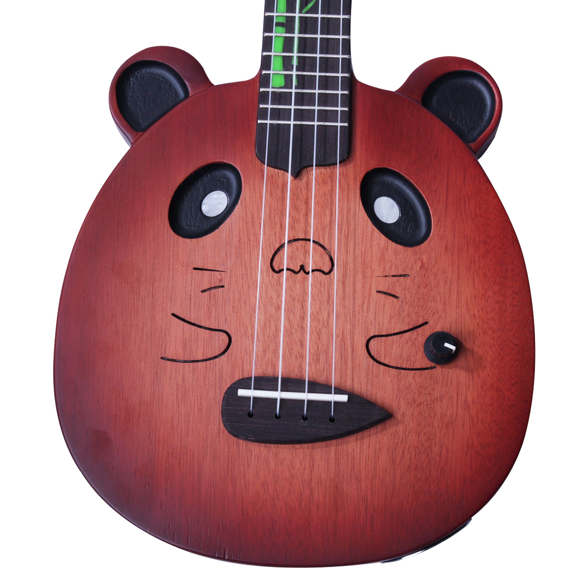 4 String Panda Shaped Electric Ukulele This electric pandalele is a must have for the ukulele and panda lovers.It comes in a stained solid natural wood finish and a glossy white finish with geared machine heads, and volume knob. The quality of these instruments must be seen and heard. The design is complete with enhanced green bamboo leaves designed onto the neck of the instruments which add character to the instrument. Equipped with a lipstick style pick up for extra kick, the clarity of tone from these instruments is exceptional and very versatile instruments with many tuning options available, comes with a gig bag.